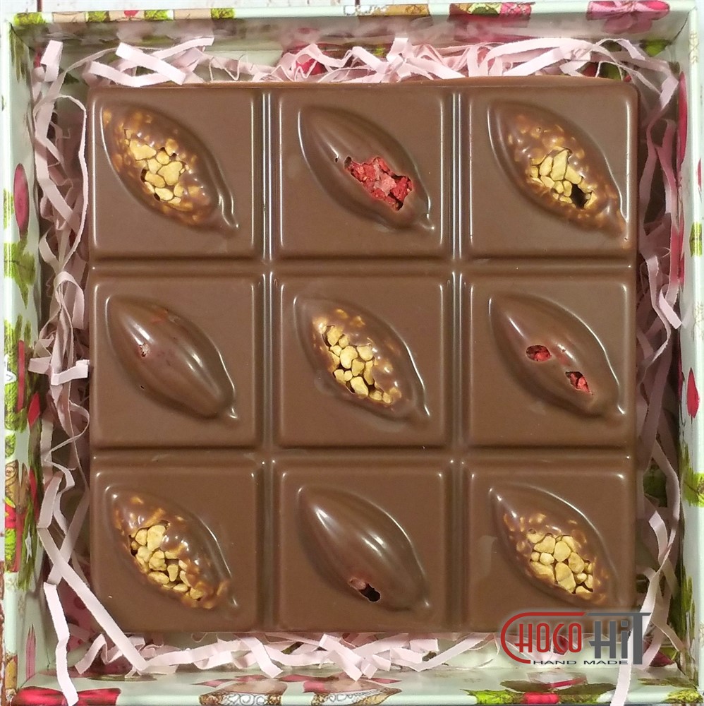 Плитка из МОЛОЧНОГО шоколада "Клубника и дутый рис" 90гр (коробка 12х12см)