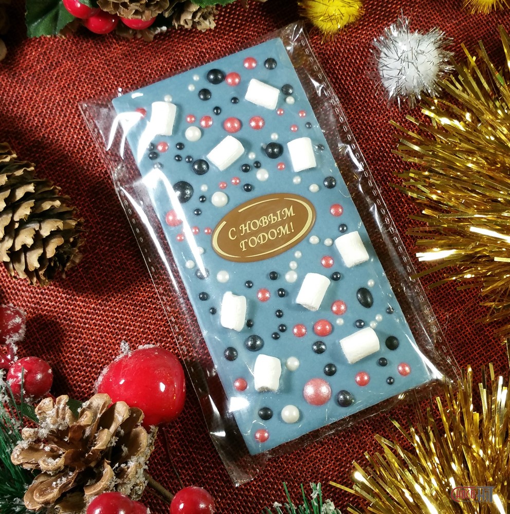 Плитка "Новый год" Белый шоколад с голубой спирулиной, декор из маршмеллоу и воздушного риса 100гр